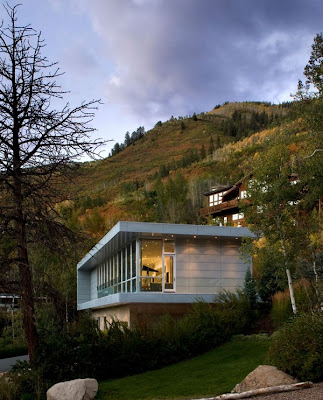 The Scholl residence was developed by Studio B Architects and is located in Aspen, Colorado. You are looking at an imposing residence that has no less than 5 bedrooms, 5 bathrooms and 6000 square feet. Here are some words from the architects concerning this project: The clients dwell between Miami and Aspen and are avid collectors of videography and photography. They requested a solution and an architecture that would exhibit their expanding and revolving collection. The exterior is composed of custom zinc panels, sand-blasted concrete, aluminum window/door glazing system and tempered glass railings. The interiors consist of darkened oak flooring, cantilevered pickled oak stairs and floors, European engineered cabinetry, Carerra marble, porcelain tile shower enclosures and integral plaster walls and ceilings.