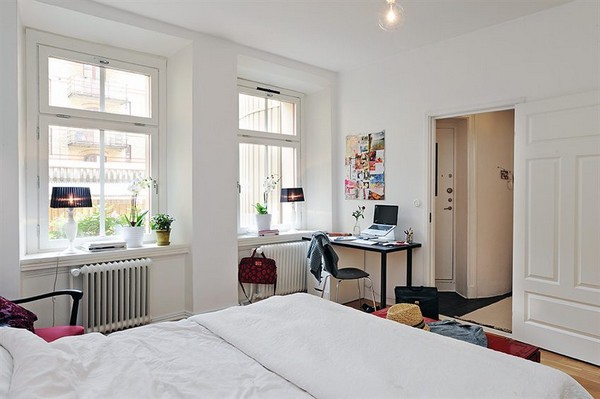 Today we will try to show a small apartment designs are simple but stands out impressed. The apartments are equipped with two rooms plus kitchen and living room with an area of ​​65 square meters. Although small in size but it looks spacious, this is because in the living room has a spacious design. Not much visible in the living room furniture, simple concepts are also outlined in the bedroom, and kitchen. Elections tend to be dominant white color, so having the impression of light and bright. Interestingly also, one corner of the room there is a beautiful fireplace, so it will add to the atmosphere is warm. Furniture of the selected few to show the impression with the concept of a minimalist black and white, for example, coffee table and desk / study that looks sweet. The living room contained a comfortable white sofa is used to relax and unwind but has an attractive design. Selected by the selection of bed king size with color covers eye-catching red. Besides the design of this apartment has a beautiful terrace with a rural feel.