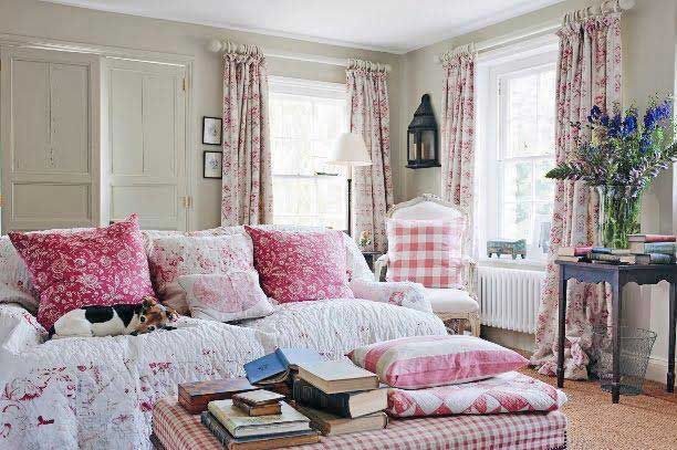 And just some lovely bright flowery, checked and plaid pillows for a porch settee.